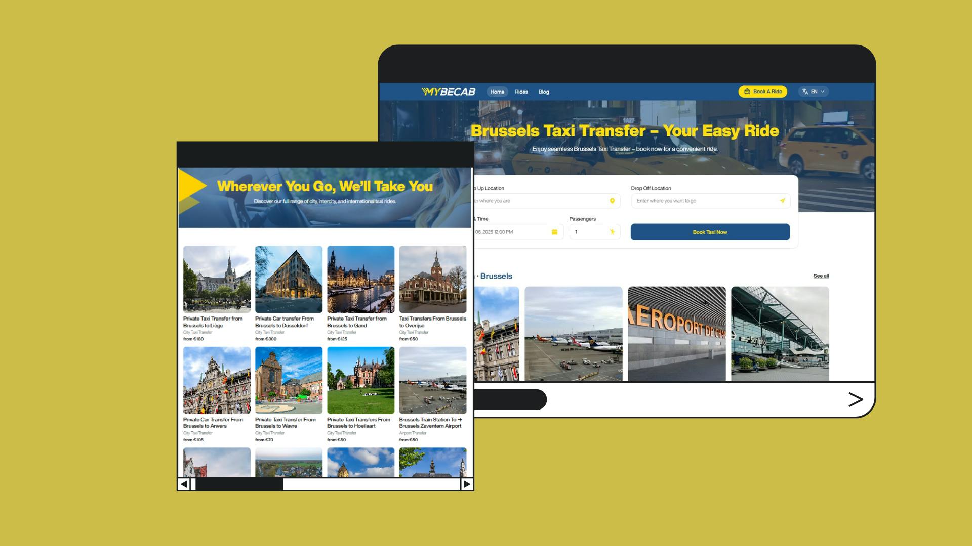 Mybecab est une solution digitale innovante qui permet aux utilisateurs en Belgique de réserver facilement un taxi ou un transfert privé, que ce soit pour un trajet urbain, un transfert vers l’aéroport ou un déplacement longue distance.